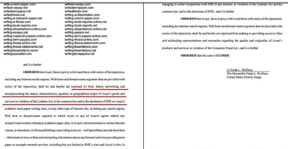 Student Research is one of the industry's founders and a highly reputable company. As it was bringing in really big bucks, many assumed that they could do the same. Whether or not they had any industry-knowledge or knew anything of the educational system in the markets they were targeting was (as far as they were concerned), besides the point. Exact Term Papers was one of these companies and, in total, it built what it considered an empire of 885 sites. The service they provided, however, was of the lowest quality possible. Naturally, students and writers complained and some did so through essay organization (functioned similar to this forum). Exact Term Paper retaliated against Student Research, arguing that it was behind these attacks. Student Research counter-sued Exact Term Papers. Please recall that Exact Term Paper initiated the lawsuit and did so in New Jersey. The end result was:
